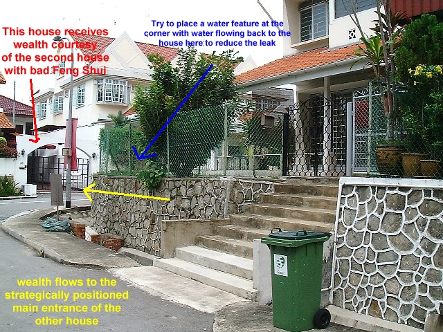 2. To reduce the leak, one should place a round water feature with water spouting towards its own house i.e. second house with bad Feng Shui.